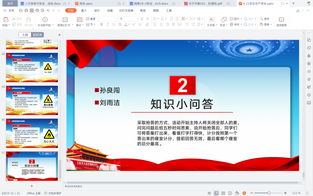 安全明白人知识问答。6月21日,大发娱乐城 学生会开展“我是安全明白人”活动。活动以微信公众号“安理人文青年”为平台,组织学生参与线上“我是安全明白人”话题讨论,并完成安全常识小测试,在院内大力营造关注安全、关爱生命的浓厚氛围。